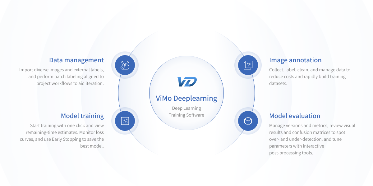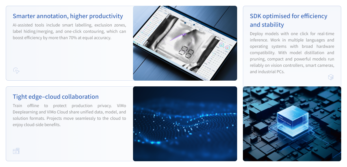 ViMo Deeplearning is the offline companion to ViMo Cloud. It focuses on intelligent data annotation, automated training, rapid model tuning, and efficient SDK inference. It enables core tasks in smart manufacturing such as material classification, defect detection, part localisation, and character recognition. This helps SMore ViMo deliver full‑scenario coverage in industrial vision and makes smart upgrades achievable.