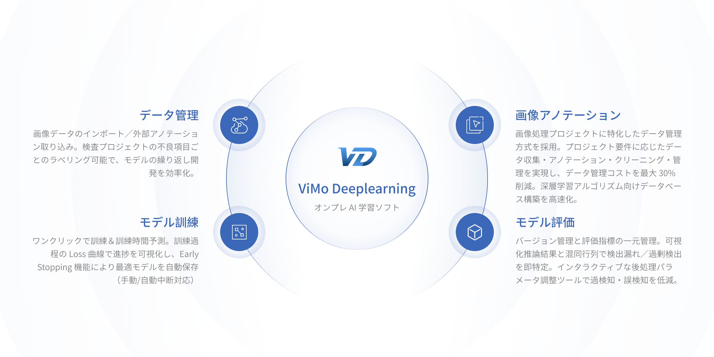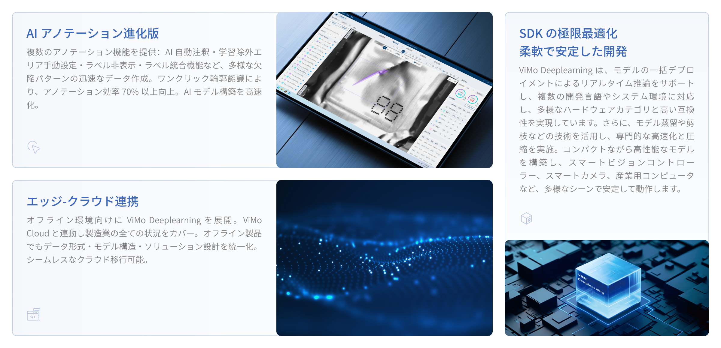 ViMo Deeplearningは、AIの学習・検証を行えるデスクトップソフトです。データ管理からAIモデルのテストまで一貫してサポートします。AIアノテーションツールや自動チューニング機能など、便利な機能を多数搭載しているため、少ない工数でAIモデルを作成できます。 ユーザーフレンドリーなUIのため、プログラミングスキルを持っていなくても材料の仕分け、欠陥検出、オブジェクトの位置特定、文字認識などのスマート製造の生産ラインにおけるコアタスクの自動化ができます